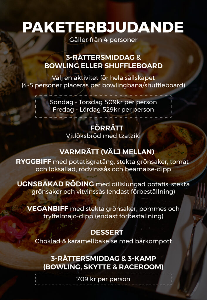 BOWLING – SHUFFLEBOARD – BILJARD – SKYTTE – RACEROOM – TJURSIMULATOR – SPORTBAR – KARAOKE – DART – 3 KAMP